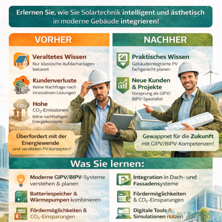 • Grundkurs gebäudeintegrierte PV- Anlage (GIPV/BIPV)„Zugelassen zur Verlängerung des Eintrags in der EEE-Liste des Bundes.“
